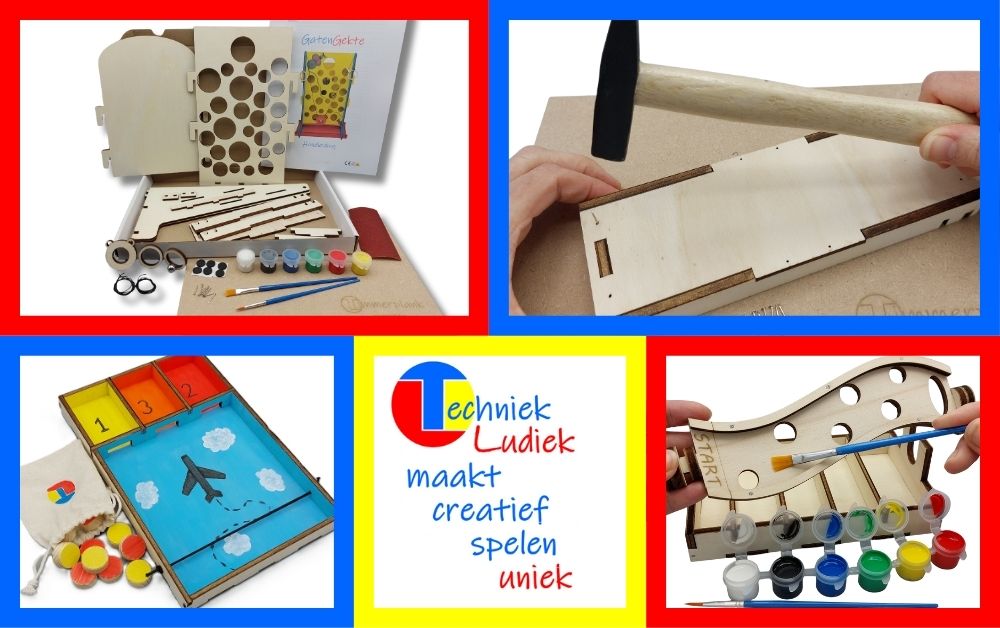TechniekLudiek heeft bouwpakketten om zelf uniek speelgoed, met bewegend element, in elkaar te zetten. Denk aan simpele mechanismen zoals draaiende onderdelen, iets met elastiek of met schijven en balletjes. Beetje schuren, timmeren, schilderen en spelen maar.